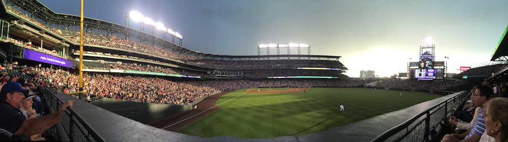 Smartphone lenses are generally fairly wide angle, but there's times where the image is much larger than the lens can see. Many phones now have a panoramic mode where you're guided to slowly pan your phone around and the resulting images are electronically stitched together (it's magic!). This photo was taken after a brief rain shower when the sun poked through the clouds with a golden light. (Coors Field, Denver)