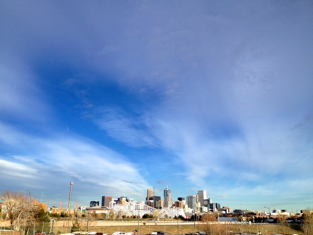 What you don't see in this image is the expansive parking lot in the foreground. This is an extreme example of placing your subject in the lower third of the frame. It's especially effective when you have colorful or interesting skies. (Downtown Denver from Mile-Hi Stadium)