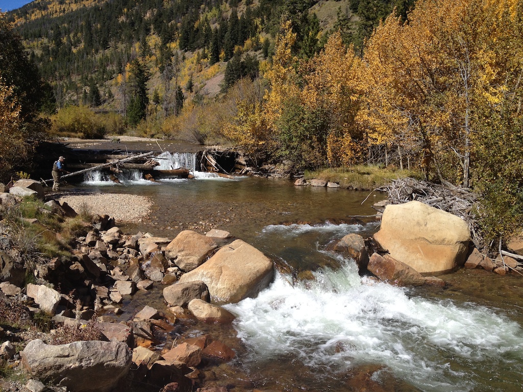 In art and composition classes you learn about thirds. The second you tilt up or pan down to put your horizon line higher or lower, your picture will immediately benefit. Taking that a step further, many great photos share a sense of diagonal visual movement. Notice the diagonal line of the stream flowing from the upper left to the lower right of the frame. (Clear Creek along I-70 west of Denver)