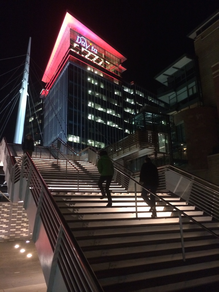 This is a pedestrian bridge a block from our home downtown. The first shot (not shown) was pretty enough without any people, but I waited until a couple walked into the frame to get a better sense of scale. Sometimes I wait for people to get out of the frame, too. Be patient, usually in a few minutes the scene will change -- and usually for the better. (Millenium Bridge, Downtown Denver)