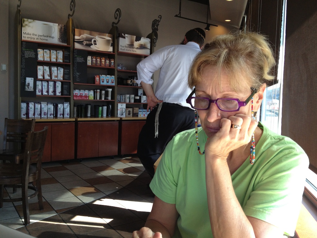 Sure there's plenty of times we all want to memorialize the moment by smiling awkwardly in front of the camera, but real life looks a lot more real when it isn't staged. Siting across from Terry at a Starbucks I was taken by both her concentration and the Orthodox Jewish man in a conversation behind her. (Cleveland, OH)