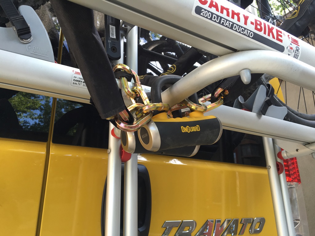 Many RVers travel with bikes on racks. In my opinion, this is the place where I need the highest security. This is the location where I'm likely to leave my bikes on a city street while I'm inside a restaurant for two hours and can't see it. This is where the bikes will be while I'm out hiking in the middle of nowhere for four hours. Accordingly, I pull out the highest level of security here.