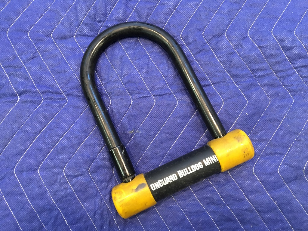 Probably the first thing that comes to mind is the typical U-Lock. Pictured above is the U-lock that we travel with, it's an older and smaller version of the OnGuard Bulldog U-Lock. I think of a good U-lock as sort of the entry point into bicycle locking. If you get a good one, it can't be defeated with bolt cutters (the preferred weapon of bike thieves). And you'd have to spend a long time with a hacksaw to get through it.