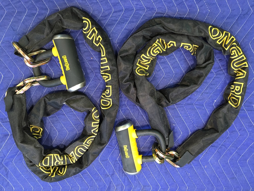 Next up is a chain lock. We travel with two of these, the OnGuard Mastiff. This chain weighs about 10 pounds (seriously). They're reinforced steel -- there's no way to cut them with bolt cutters. And even a hacksaw or angle grinder is going to need a good bit of time to get through them. These are the locks we use on the outside of our RV when we lock bikes up to the back. It's the highest level of bike security we RV with.