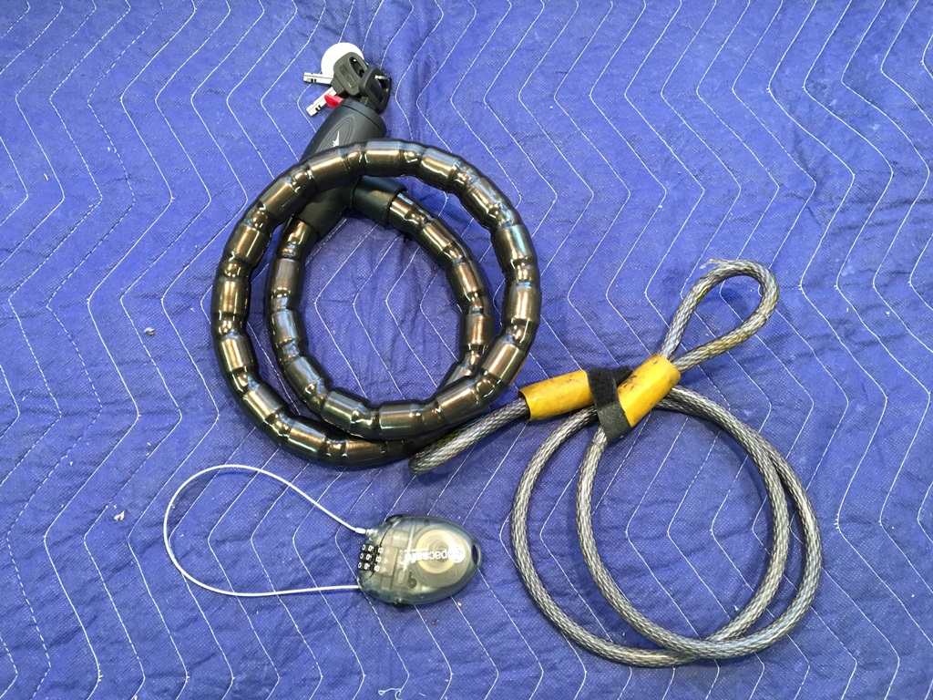 And finally, there are cables, cable locks, and other hybrid locks. These are the easiest to defeat -- most of them can be defeated with just cable cutters or bolt cutters. Personally, I don't rely on these for primary security, but we do travel with one cable. We also have a Pacsafe Retractasafe that I carry sometimes. It's terrible primary security for a bike, but it can be useful for things like locking your bike when you're dining at an outdoor cafe and can see it. (In that case, I just need to slow the thief down so I can catch them.)