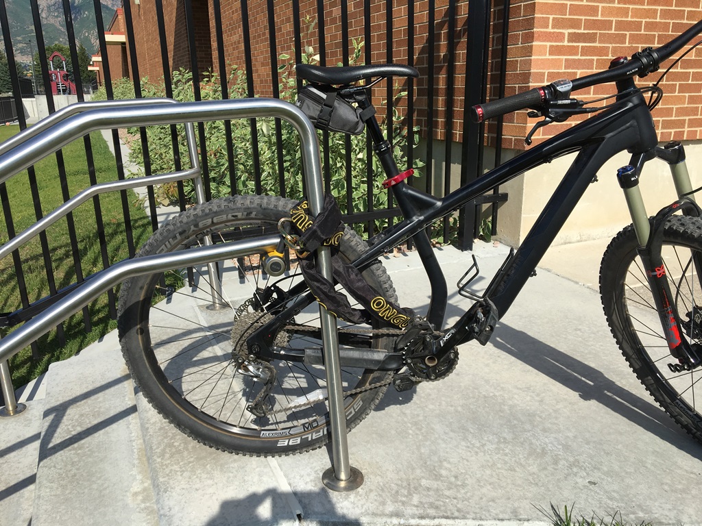 If I have only one bike to lock in this situation, I'll just use one lock. If I have two bikes to secure I'll set them nose to tail, and use two locks as you see above. This has the benefit of securing the front wheels on each bike as well. With 20 pounds of deterrent, I'm pretty confident about leaving the bikes outside on the rack in most circumstances.
