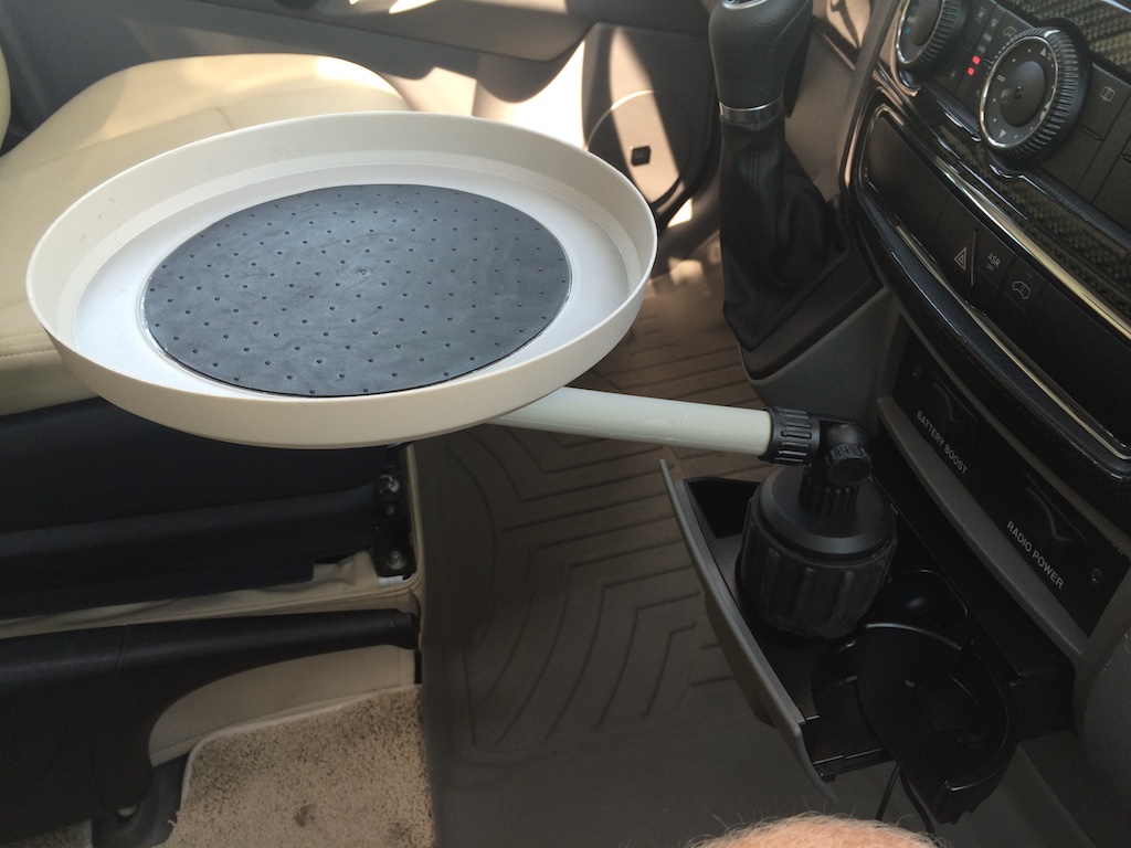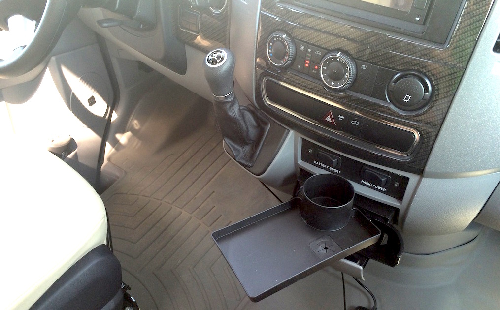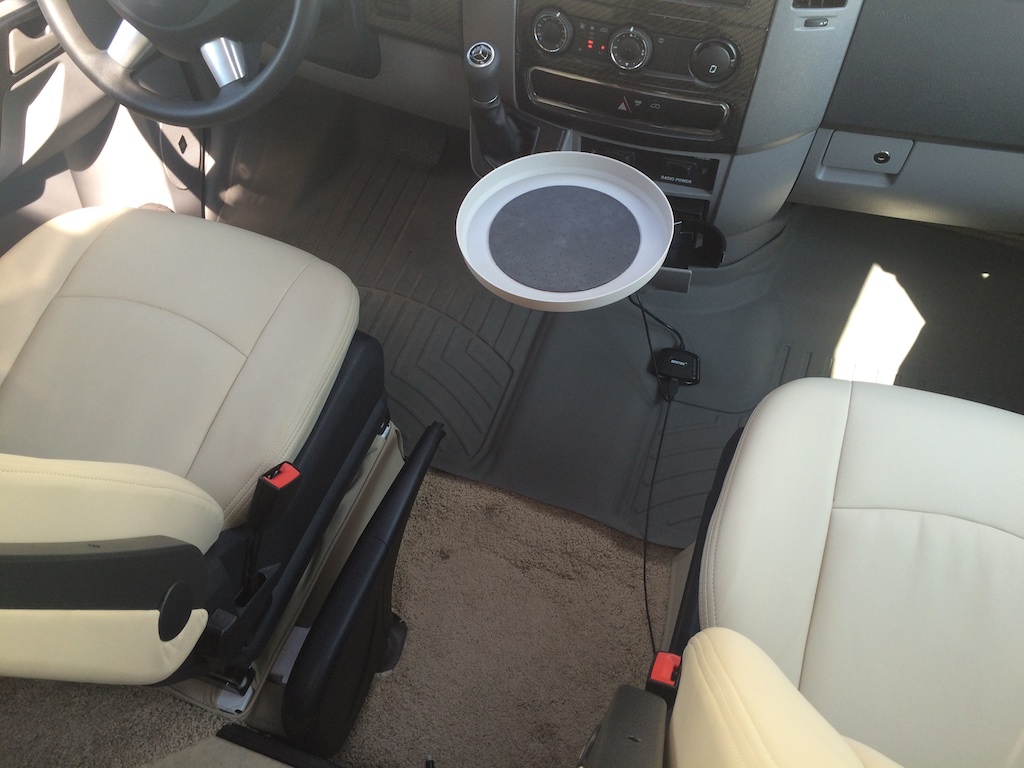 As the owner of the Sprinter-based Navion I found that the high dash really made for an unsafe reach when going for celery sticks (healthy) or chips (not as). My first thought, as it is with most RVers, was, "what could I buy and modify?" My second thought was, "isn't there a little tray product out there already?"