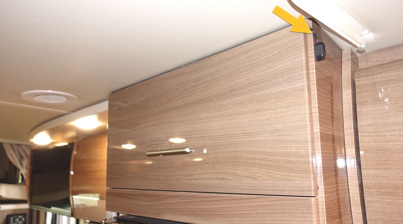 This IR repeater looks for remote signals from the Navion's bedroom. The cable runs back to the IR hub behind the TV cabinet in the background.