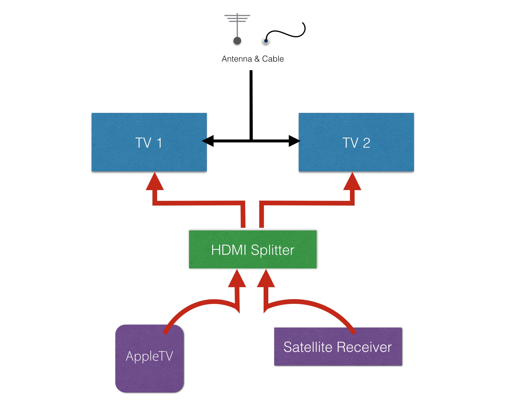 My goal was to be able to switch between our satellite receiver and an AppleTV digital media player. Both devices use HDMI for output. To switch between the boxes, but send the same signal to both TVs at the same time, I bought a small HDMI splitter. So I didn't wind up with a rat's nest of cables I bought several short (2 foot) HDMI cables. Along those same lines, I opened up the power strip and then cut, shortened, and re-soldered the cord so I only had less than a foot sticking out. This also provided the convenience of being able to shut off all the electronic systems (primarily for dry camping at night and not draining power through our inverter).