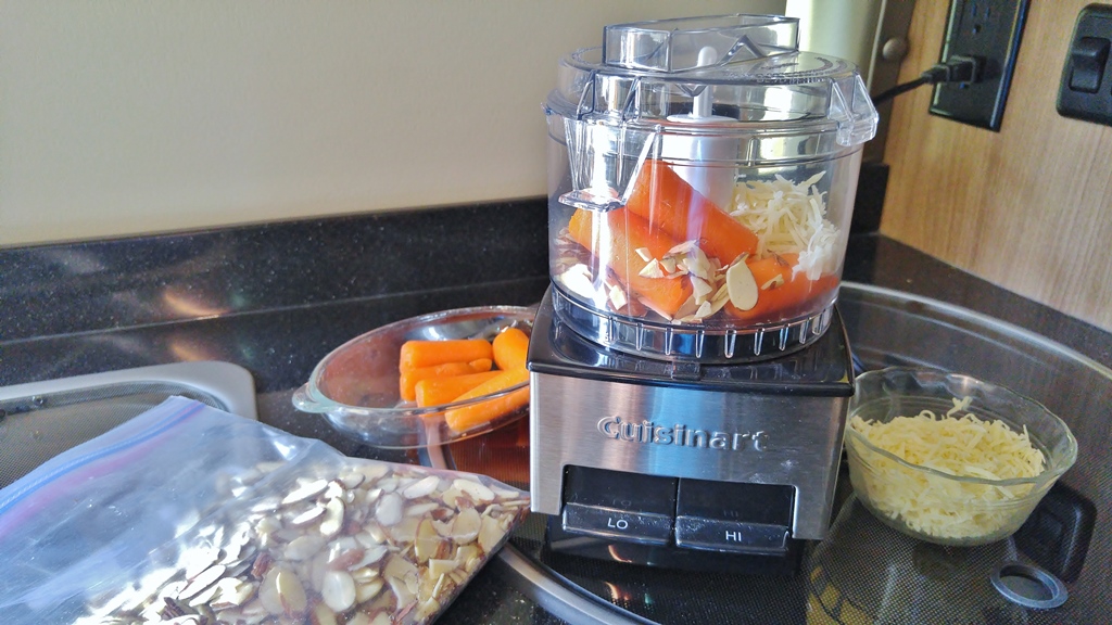 We travel with the Cuisinart Mini-Prep, a tiny version of the traditional Cuisinart. Since we try to eat "raw" as much as we can, a food processor is pretty much a required staple in the RV. Not only do we use it for chopping veggies and fruits, we also make lots of raw energy bars with it. This was a big hit last year on the Driftless Adventure group RVing tour, since I made lots of fun bar recipes and handed them out to fellow RVers! The most popular was our Carrot Cake Energy bar Once you try it, you'll see why we travel with this gadget. And another bonus, just like the Magic Bullet it only uses 250 watts, so again, it'll work just fine off a portable inverter.