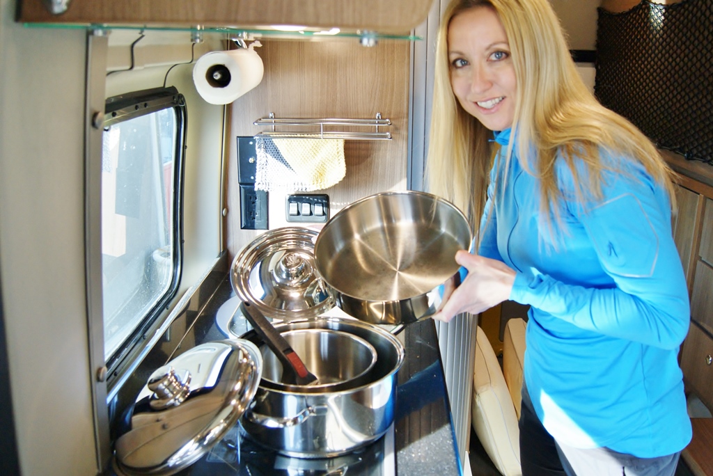 Stef showing Magma cookware set while standing in kitchen of Winnebago Travato.