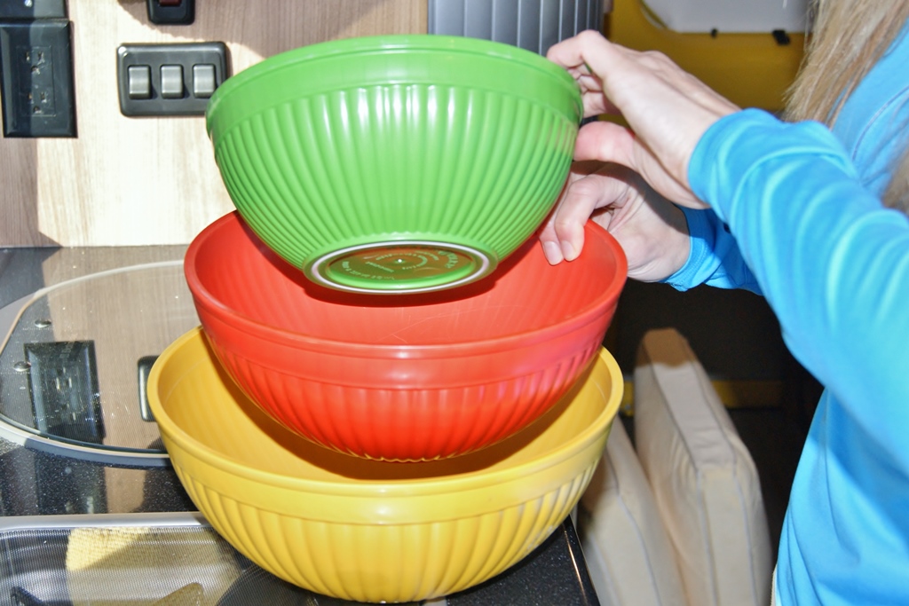 We use these bowls made by Nordic Ware all the time in our RV meals, and again, love the "nesting" concept. The bowls are very sturdy and have a white silicone ring around the bottom so they're super grippy and won't move around when the RV's in motion. They're surprisingly lightweight, won't break if dropped, BPA-free, microwave-safe, and well, they're just perfect for our RV lifestyle.