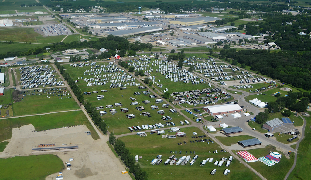 Each year almost a thousand RVs converge on Forest City, Iowa for the Winnebago Grand National Rally. Here you can see the expansive rally grounds with the Winnebago manufacturing facility in the background.