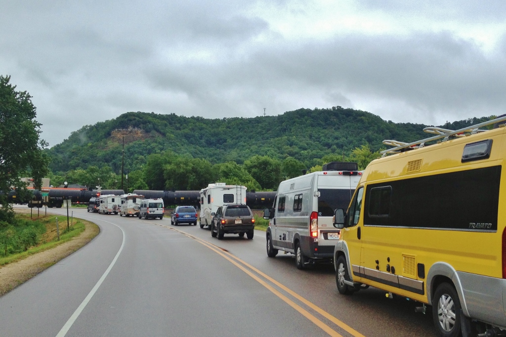 Line of Winnebago motorhomes lined up waiting for a train to pass by."RVs, Trains, and Automobiles..."