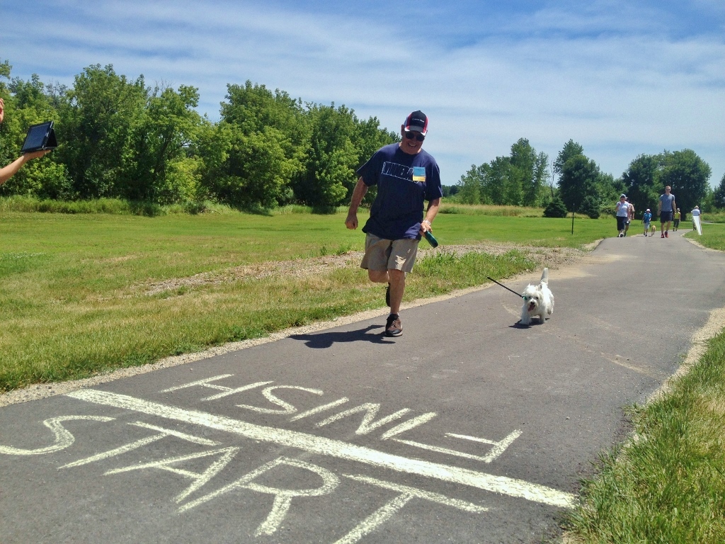Man and dog heading toward finish line on a path.Here's one of the medal winners in the Dog Category, pulling his dad to victory: congrats, Missey!