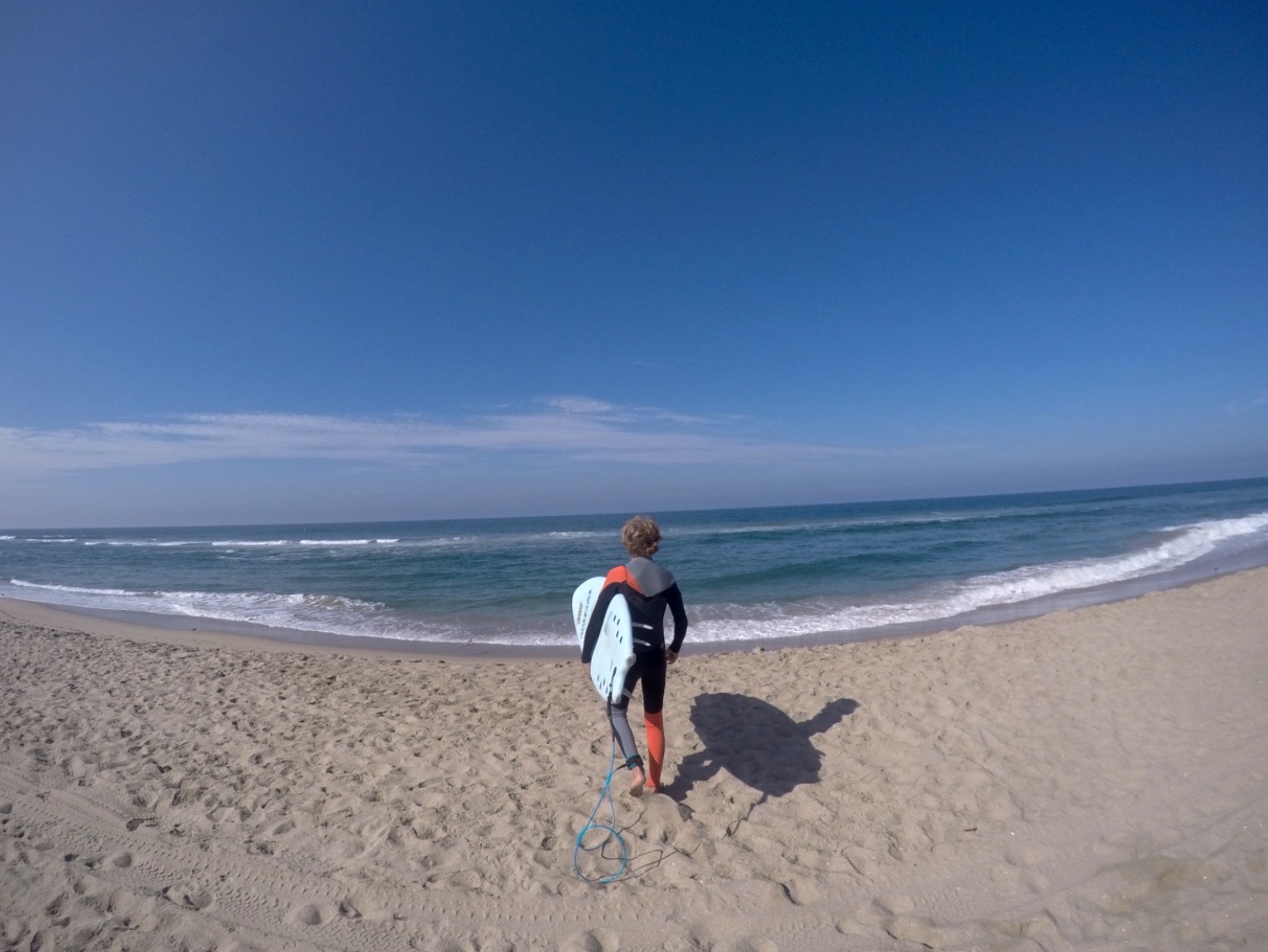 Clarence's last day on Huntington Beach. An early morning session with Dad. Photo credit: Mike Beltz