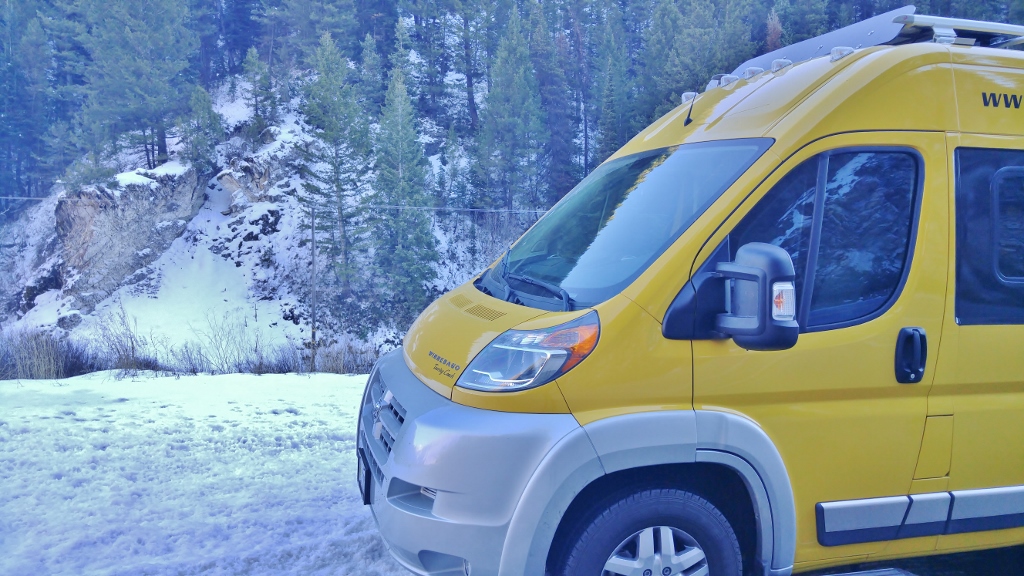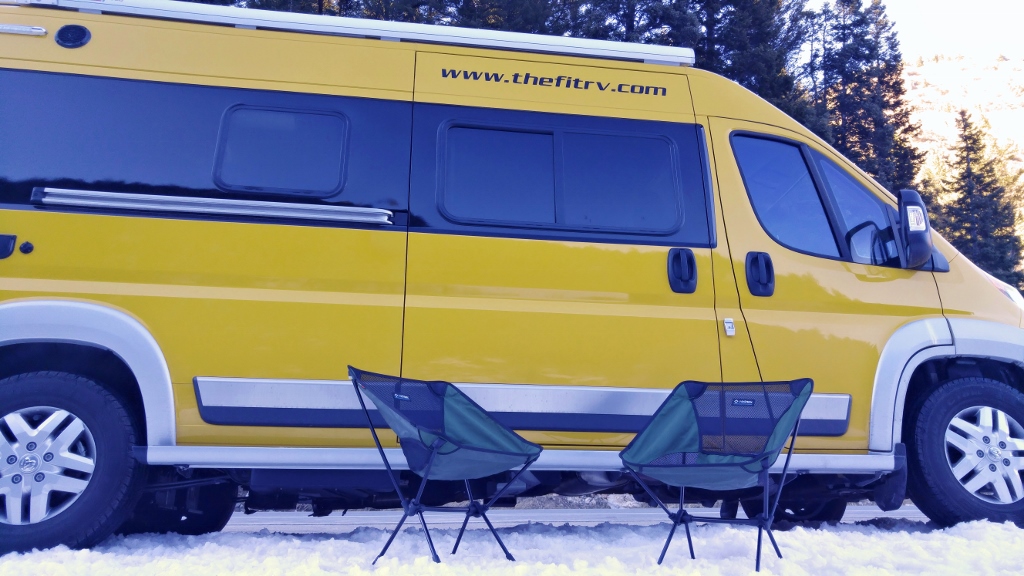 Winnebago Travato parked on snow covered ground with lawn chairs sitting outside.