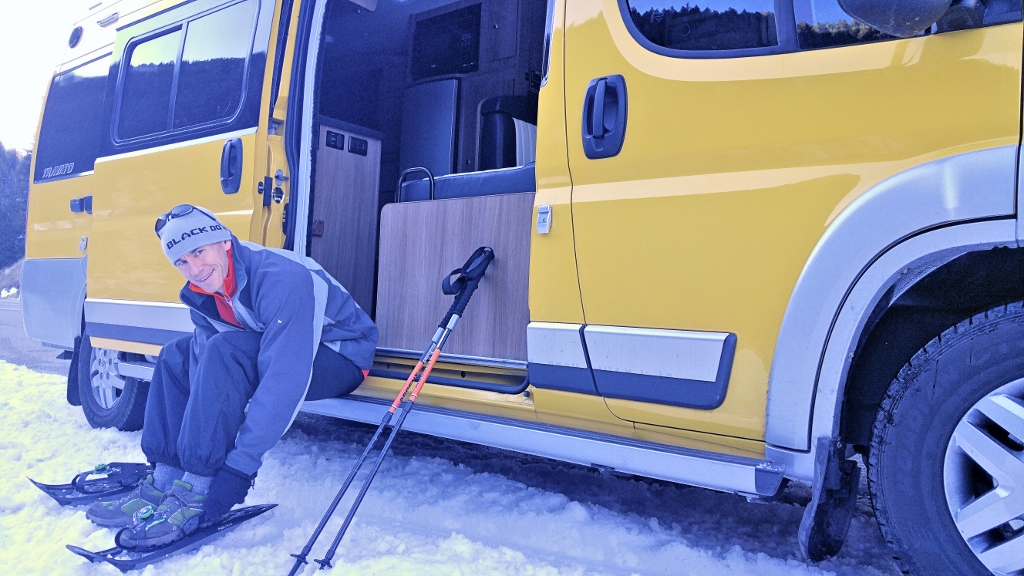 James sitting on the edge of the Winnebago Travato putting snow shoes on.