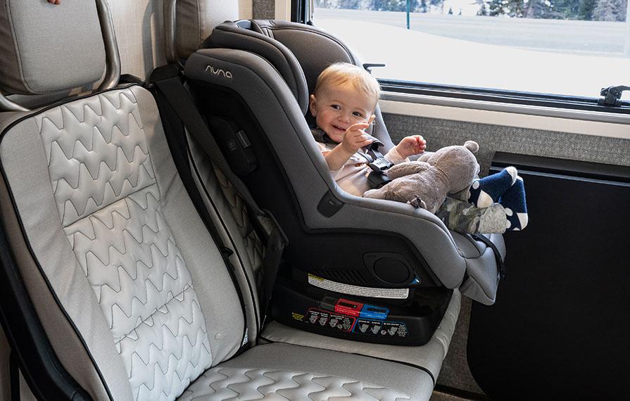 For example, while traveling in a Winnebago Forza, Heath and Alyssa Padgett used the anchors near the front-facing dinette seating area to secure their baby’s car seat. In this article about tips for RVing with a baby, Alyssa notes that it is important to make sure there is enough room for the car seat to be buckled in safely and face the right direction. For them, this meant lowering the table to have enough room. But the lowered table ended up being a great place for storing snacks and toys!