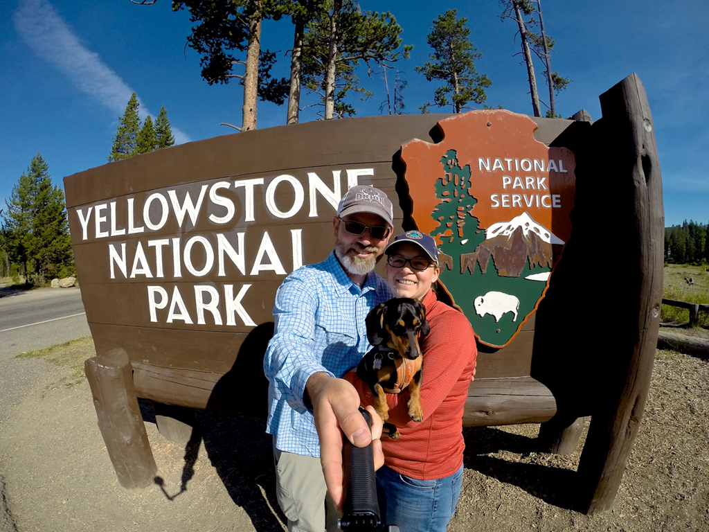 Couple with a dog taking a selfie in front of Yellowstone National Park sign.