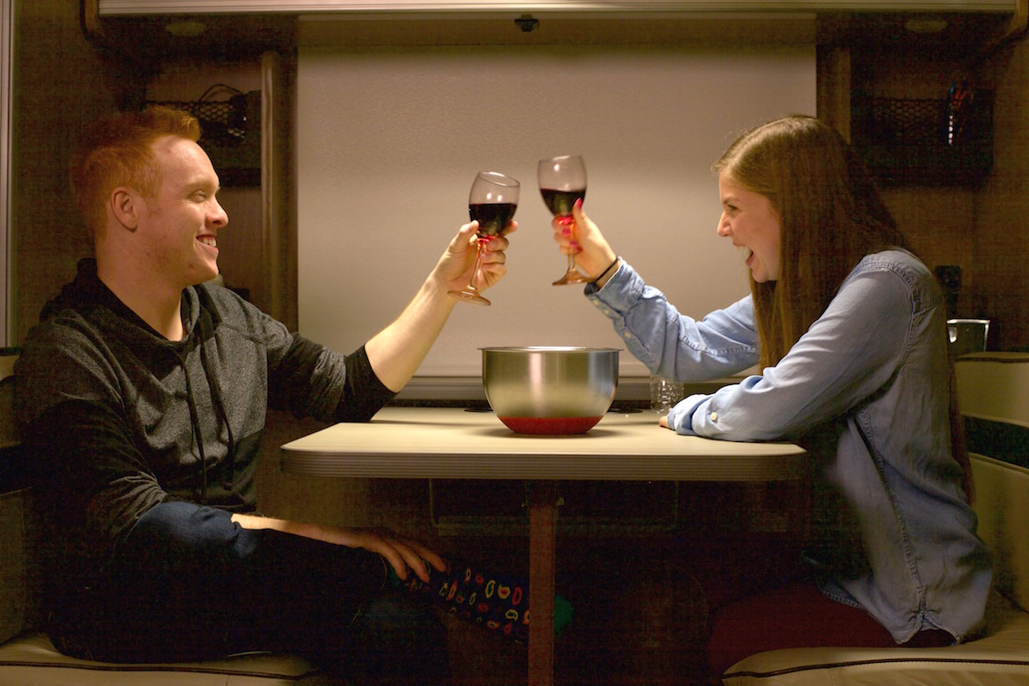 Alyssa and Heath Padgett toasting with wine at their Winnebago Brave dinette.