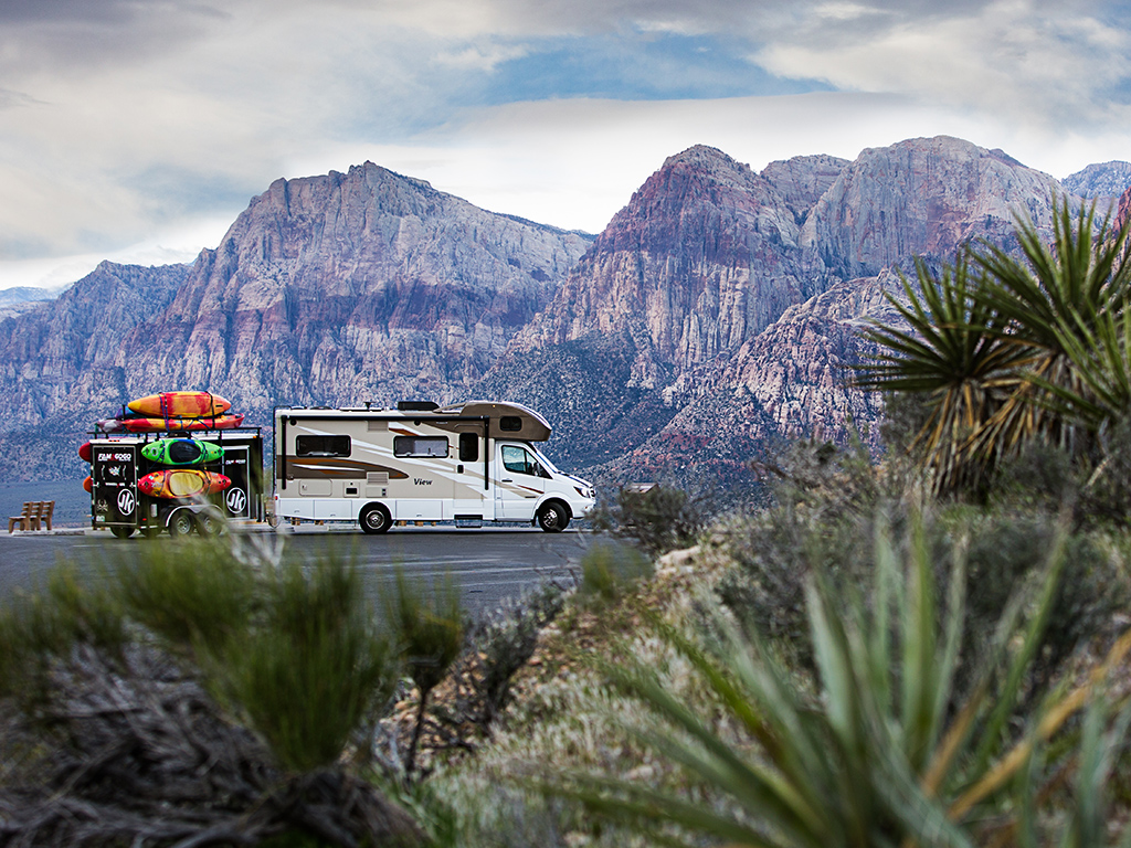 Winnebago View with trailer attached parked in lot with mountains behind.
