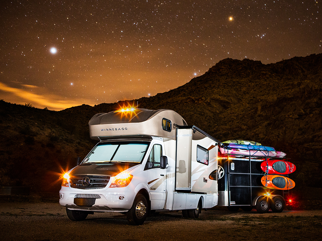 Winnebago View with trailer attached and a star filled night sky overhead.