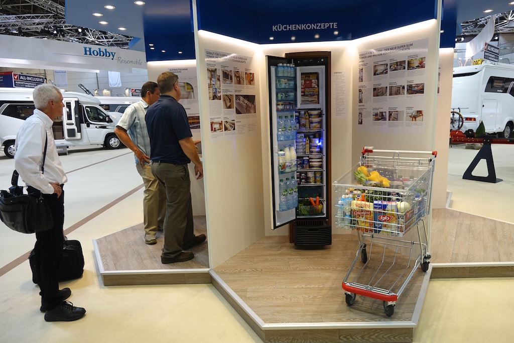 Thin is in! These vertical designed refrigerators were very popular in the new models. This display will give you a good sense of the capacity and it certainly attracted the attention of three of the Winnebago team.