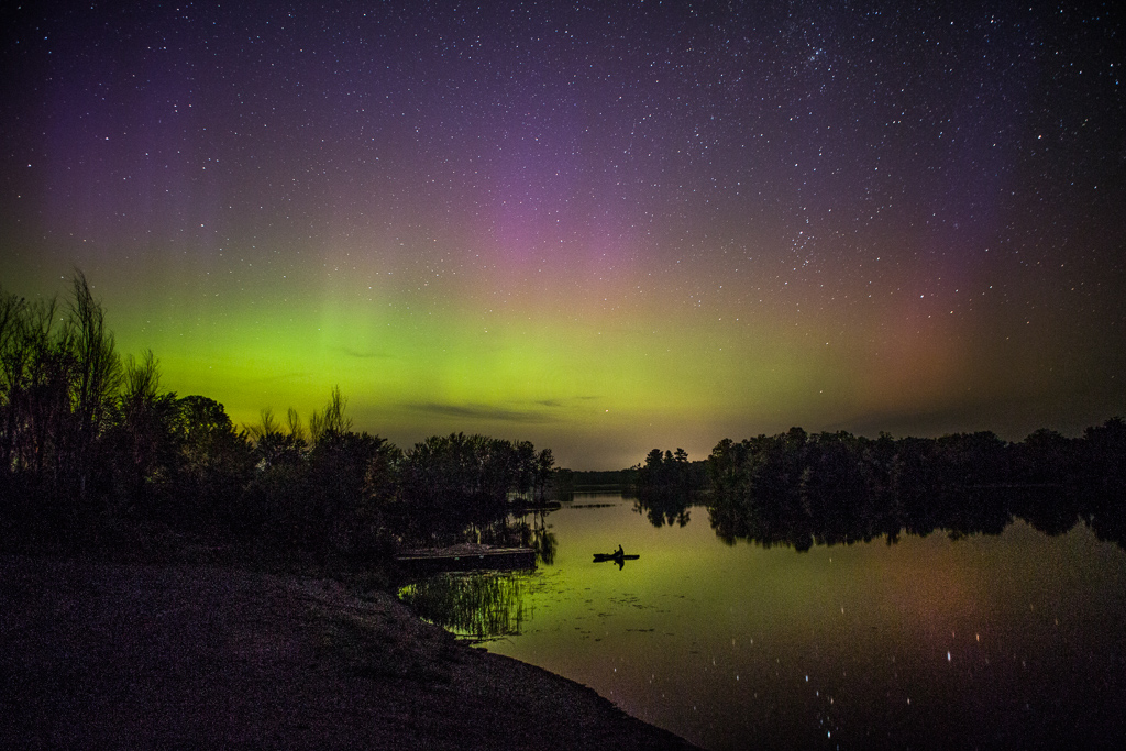 World champion kayaker, Eric Jackson, paddling out into the Ottawa River for the best view of the Northern Lights, Beachburg, Ontario.