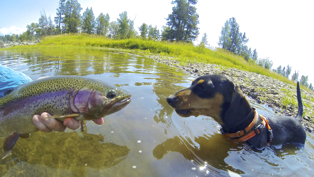 Tripper nose to nose about 2 inches away from a fish being held.Nose to gill. Tripper meets an Idaho rainbow. Who says Daschunds don't like water?