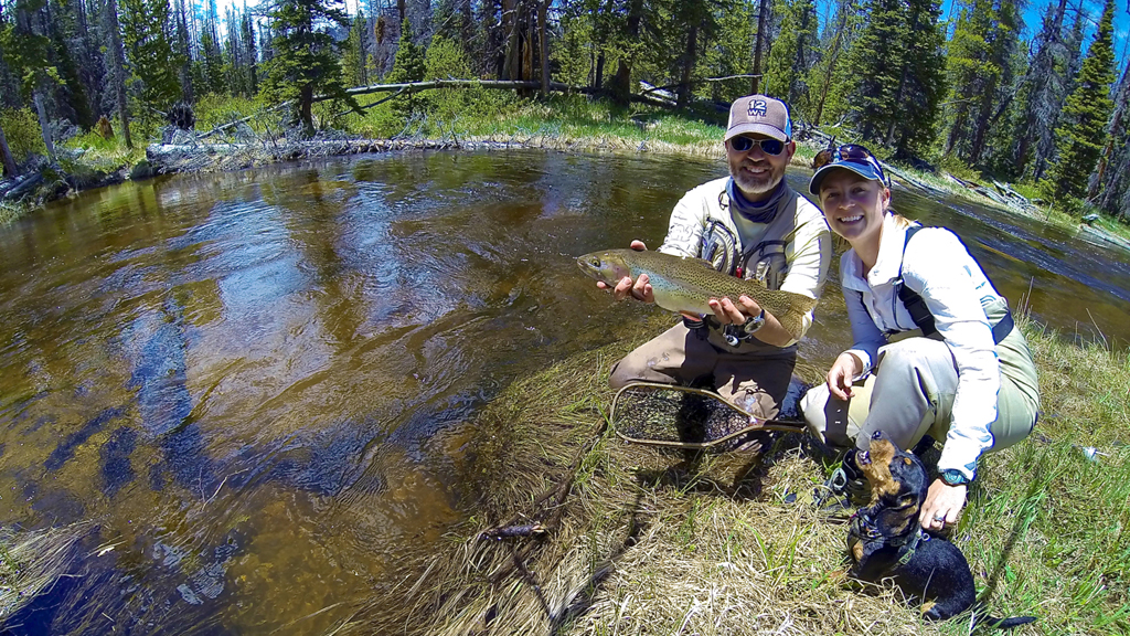Damon holding a fish with Ashley kneeling next to him and their dog Tripper barking at the fish.Tripper barks his approval at a hefty Colorado trout.