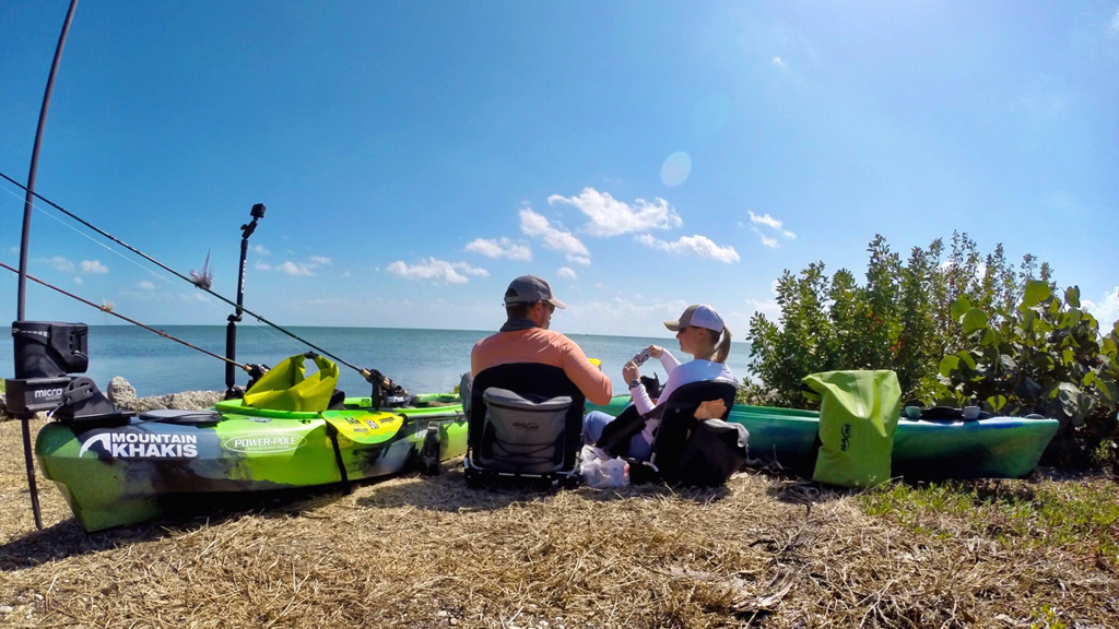 Damon and Ashley resting on the shore eating lunch with kayak and gear around them.Time off for lunch in Key West, Florida.