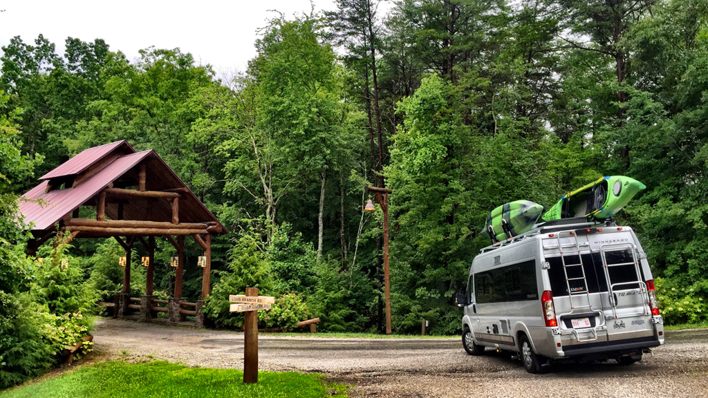 Winnebago Travato with kayaks on top about to pass under a covered bridge.Maiden voyage of the Travato as it heads off from Tennessee to Arkansas.