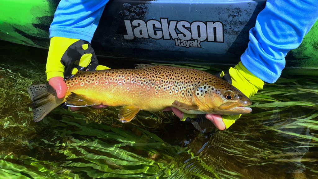 Fish being held above the water.The Travato's first streamside stop at White River Arkansas yields a hefty brown trout. (Size of catch and mileage may vary!)