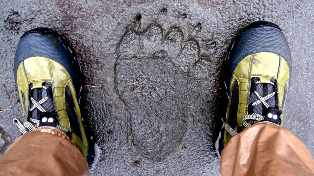 Bear paw print in mud between mans feet.Safer at a distance. Damon sizes up a brown bear print in Alaska.