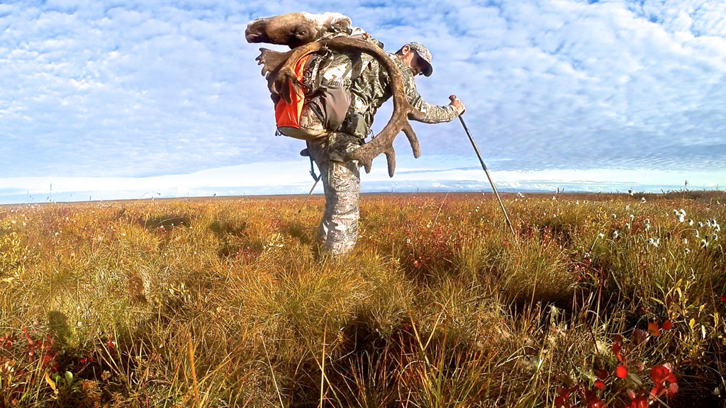 Damon with Caribou head strapped on his back while standing in grassy field.Roof rack. A successful caribou hunt in the Brooks Range in Alaska.
