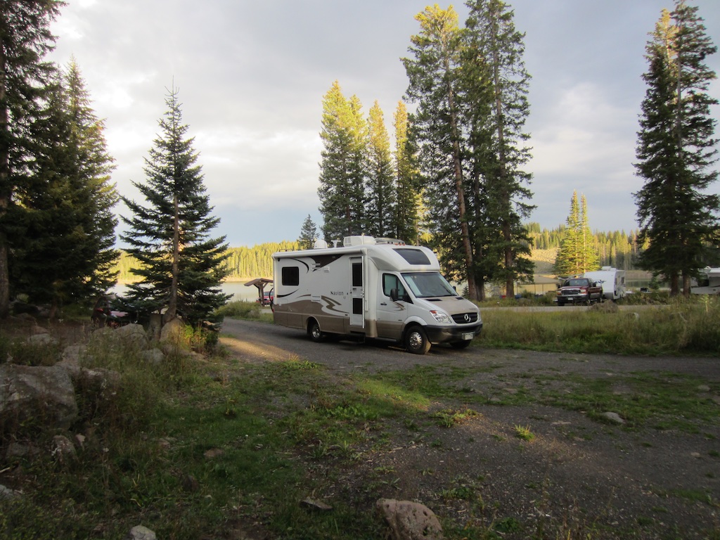 Winnebago Navion parked in tree surrounded campsite.Grand Mesa, Colorado. National Forest camping at 10,000'.