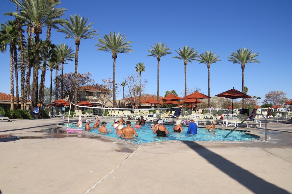 Large group of people in a pool with palm trees surrounding.Snowbirds flock at Golden Village Palms in Hemet, California.