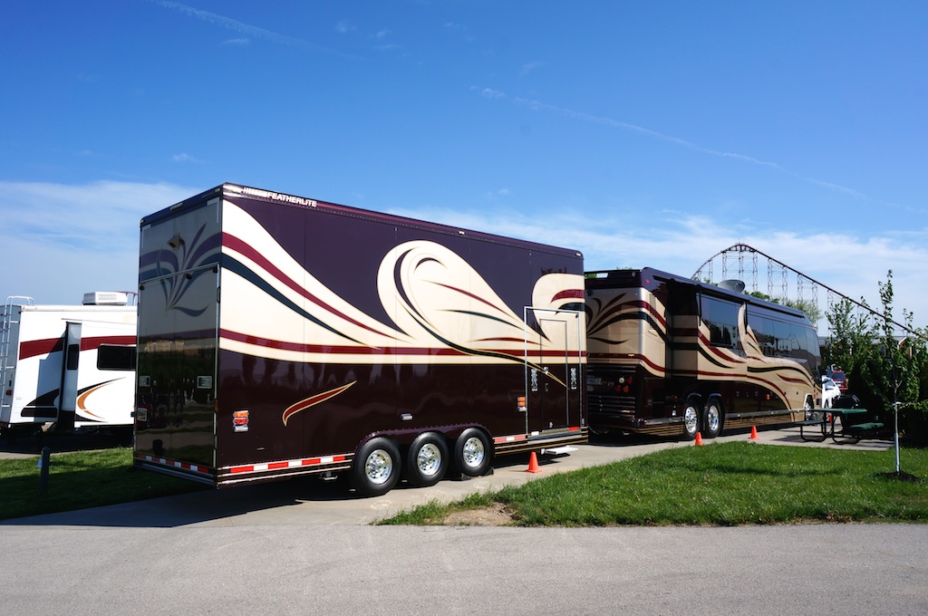 Large motorhome and large trailer attached.A super luxury RV at Worlds of Fun in Kansas City, Missouri. The Cadillac (not seen) was painted to match.