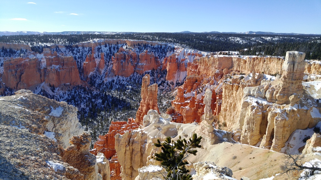 Bryce canyon with snow scattered across the terrain.Bryce Canyon in snow is amazing -- and the only way to see it like this is in the winter.