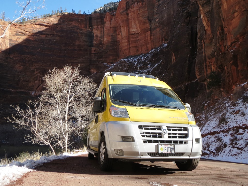 Winnebago Travato parked at the base of a canyon.Zion National Park -- One of a thousand RV destinations that's better in the winter without the crowds.