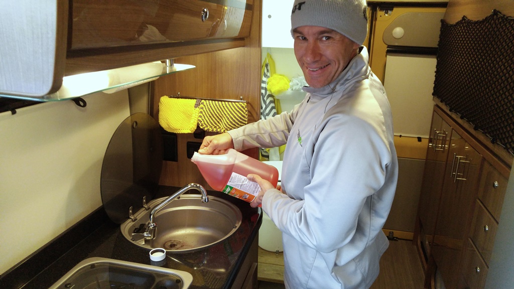 James pouring antifreeze down kitchen sink.RV Antifreeze is your friend!