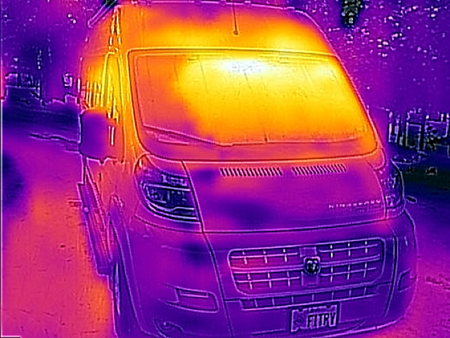 Infrared view of window heat loss on Winnebago Travato.Orange = heat leaking out of our RV!