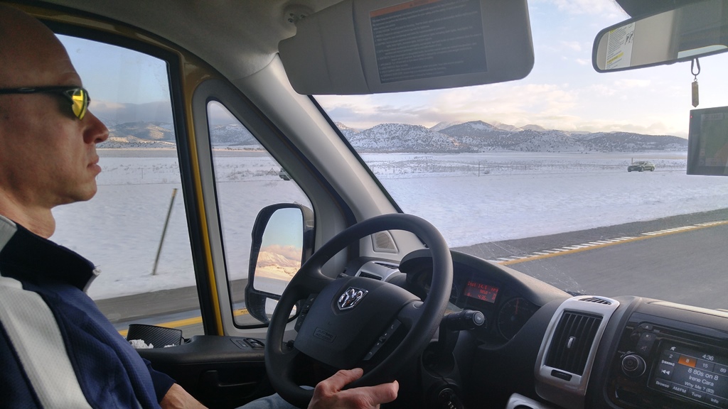James driving Winnebago Travato on road with snowy surroundings.Yours truly -- off to our next winter RV destination.