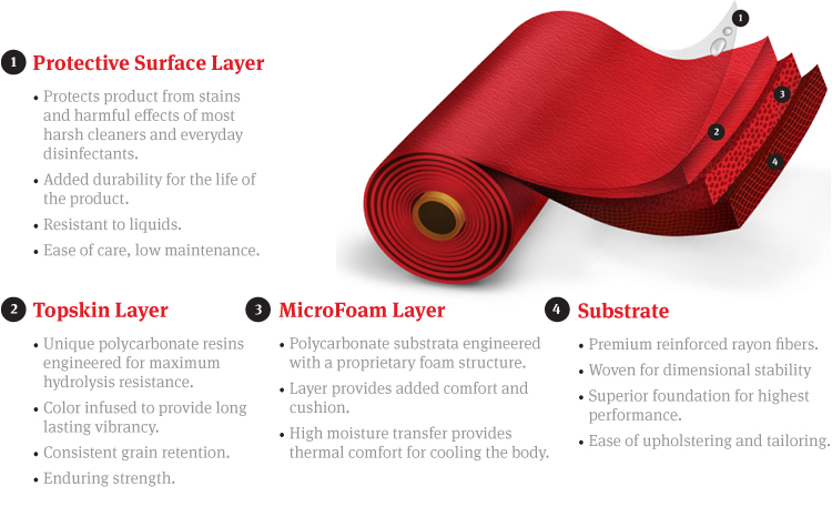 To the touch, Ultraleather has a soft, buttery hand for luxurious comfort. It breathes well so that during long days of driving the fabric doesn't get wet or sticky, like inferior vinyl products. Unlike most leathers, it won't crack or dry out over time. Ultraleather is resistant to sun fading and, most importantly, resists stains and is very easy to clean.