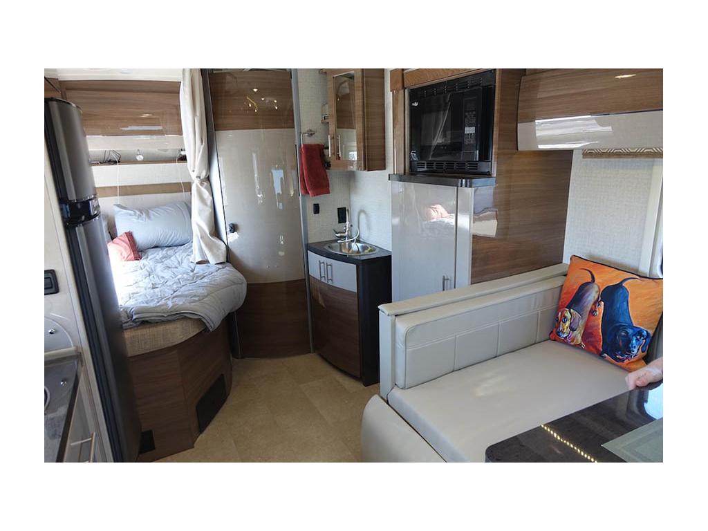 The corner bed worked for us, especially with the convenience of a Travasak (no longer manufactured, but similar to the RV Superbag). For more information on bedding click here for a more in-depth story. The shelf above the bed was a great place to place our iPads and phones for charging while we were sleeping. Under-bed storage access with a gas strut lift made lifting the bed very easy.