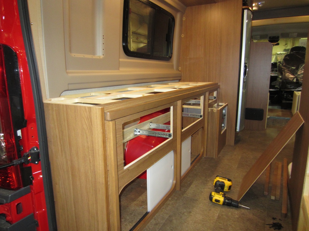 Cabinetry ready for doors and drawers to be put in.Cabinetry is designed for maximum storage and double use as the bed platform.