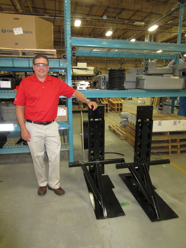 Russ Garfin next to building materials.Product manager, Russ Garfin, leans on the substantial seat and cabinet anchors.