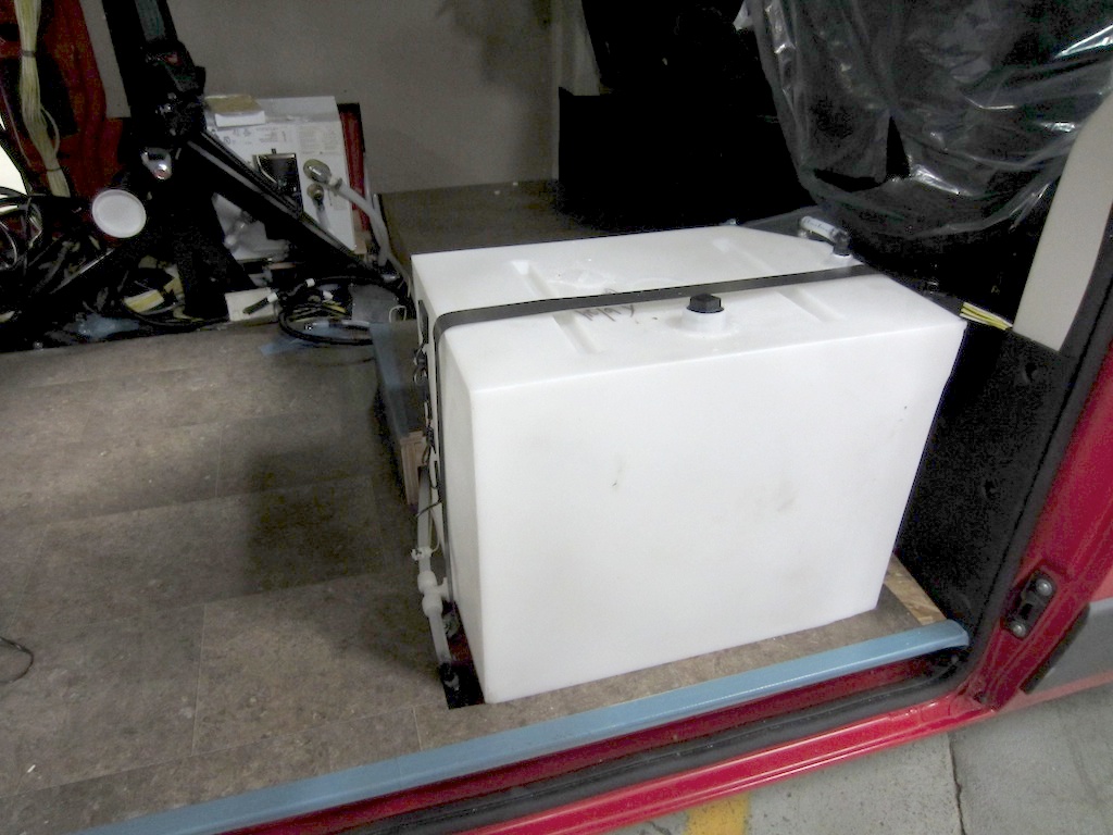 Fresh water tank sitting in Winnebago Travato.Soon to be a seat, the fresh water tank will be cleverly hidden.