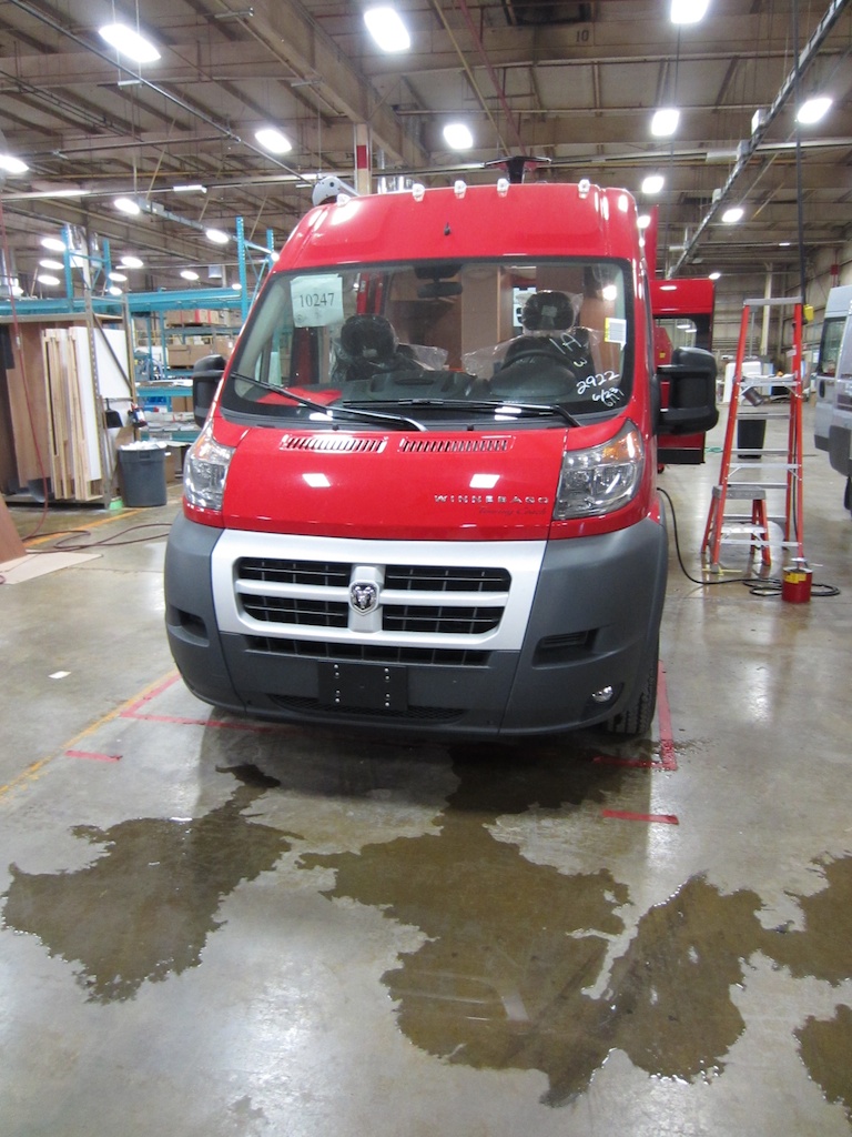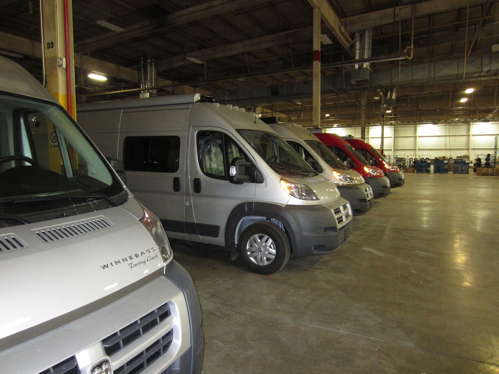 Sitting in an enormous building the size of several football fields, a row of RAM ProMaster vans wait their turn to begin their metamorphosis into a Travato to join the new Winnebago Touring Coach brand along with the Mercedes Sprinter-based Era.